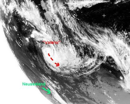 Westlich von Tonga liegt der tropische Zyklon 'Vaianu'. Zur Zeit erreicht er Windgeschwindigkeiten von 140 km/h und Böen bis 170 km/h. Berechnungen zufolge soll er weiter südostwärts ziehen und sich langsam etwas abschwächen.