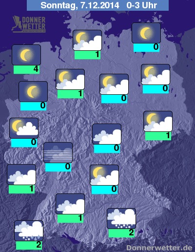 Vor allem im Nordwesten sowie im äußersten Nordosten klart der Himmel in der Nacht zum Sonntag örtlich auf. Ansonsten verdeckt wechselnde oder dichte Bewölkung meist die Sicht in den Sternenhimmel, Niederschläge in Form von Schneeregen oder Schnee sind nur vereinzelt im Süden zu erwarten. Tiefstwerte um 4 bis 0 Grad C.