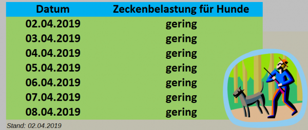 Das wechselhaftere Wetter in dieser Woche hat auch seine positiven Seiten - so bremsen zeitweilige Schauer nicht nur den Pollenflug ein wenig aus, die niedrigeren Temperaturen, vor allem in den Tagen bis zum Wochenende, dämpfen auch das Hundezeckenaufkommen im Unterholz.