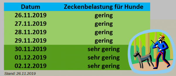 Die milde Witterung, vielerorts kann das Thermometer wieder auf Werte über 10 Grad C steigen, kann im Süden und Westen Deutschlands wieder zu einem lokalen Aufleben der Zeckenaktivität (z. B. Igelzecke) führen.