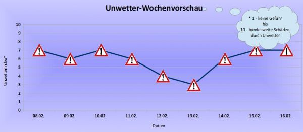 Der Montag startet bereits meist sehr windig und hier und da sogar stürmisch, regional ist mit schweren Sturmböen (vielleicht auch orkanartige Böen) zu rechnen. Der Dienstag wird voraussichtlich nur etwas weniger windig, bevor der Wind am Mittwoch in weiten Teilen wieder stark und teils stürmisch wird. Nach einem widerum windigen Donnerstag, beruhigt sich das Wetter am Freitag dann nur vorübergehend, bevor es in ein oft nasses und windiges Wochenende geht. Der Winter beschränkt sich nächste Woche weiterhin auf die Hochlagen der Mittelgebirge und vor allem die Alpen, selbst die Nächte sind zum Großteil frostfrei.