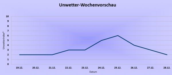 Die Gefahr durch Unwetter ist in der laufenden Wetterwoche zunächst nur gering. Unter Hochdruckeinfluss herrscht überwiegend ruhiges, trockenes und für die Jahreszeit eher durchschnittlich kaltes Wetter. In den überwiegend frostigen Nächten muss jedoch vermehrt mit Rauhreif und teils auch mit überfrierender Nässe gerechnet werden. Zum Wochenende hin bringen Ausläufer eines Tiefs vorraussichtlich über der Nordwesthälfte Deutschlands vorübergehend stürmisches Wetter. An den Küsten ist das mit Sturm zu rechnen.