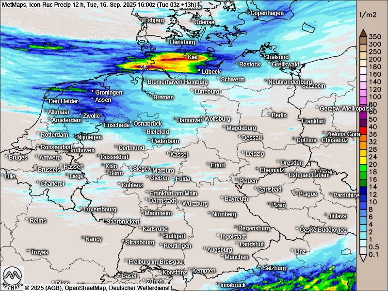 Intensive Schauer und Gewitter ziehen von der warmen Nordsee über die Elbemündung und zur Küste Schleswig-Holsteins und bringen Regenmengen von 10 l/m² und mehr pro Schauer. Am Ende des Tages können es etwa in Dithmarschen 40 l/m² und mehr sein.