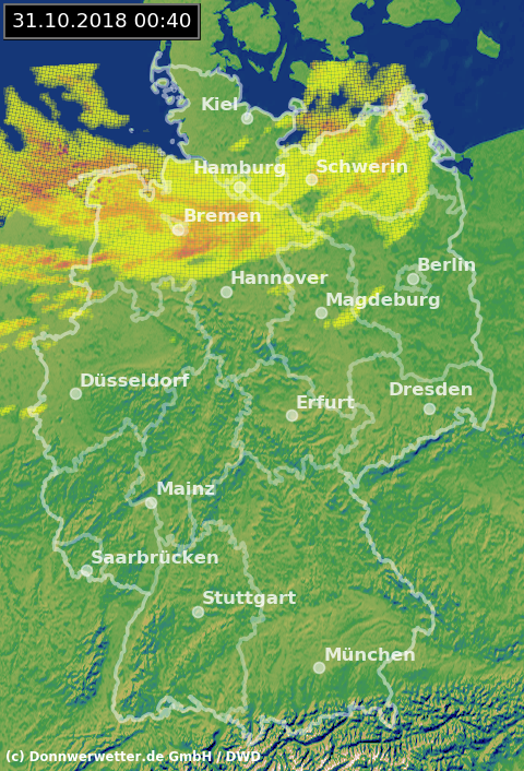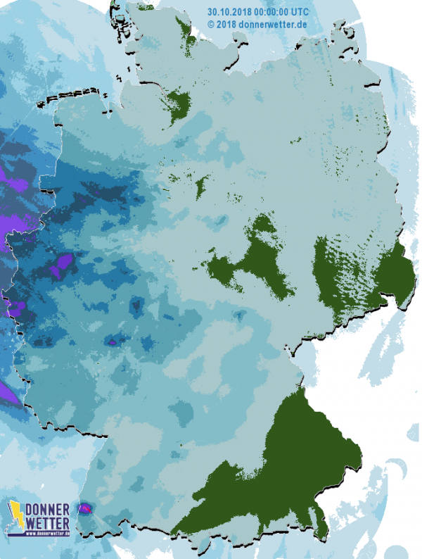 Das Radarbild zeigt aktuell im Norden noch eine Zone bestehend aus leichten bis mäßigen Signalen mit Regen, die Richtung Nord bis Nordost zieht. Sonst präsentiert sich der Himmel über Deutschlands im Norden, sowie in der Mitte überwiegend wolkenverhangen, im Osten und Süden vorwiegend sternenklar.