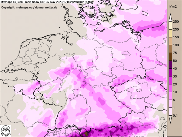 Die Karte zeigt die zu erwartende Intensität der Schneeschauer am Samstag, 25.11.2023 (12:00 Uhr) für Deutschland.