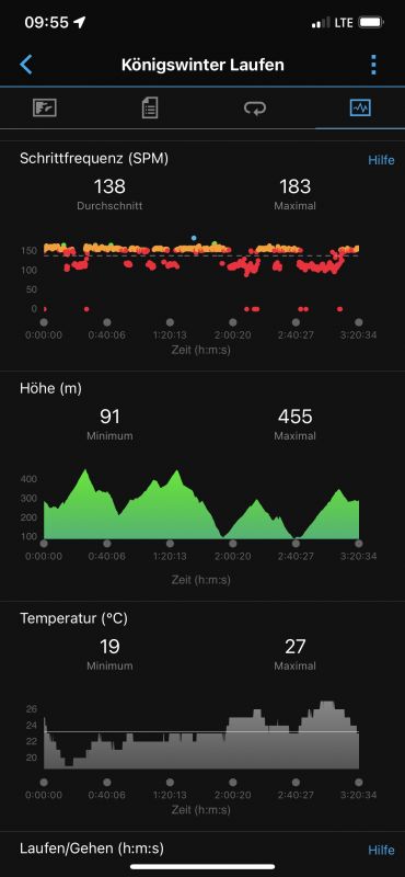 Dann musste wieder "umgeschaltet" werden. Über die Bahnbrücke, und schon wieder eine Treppe hoch! Dieses sich immer wiederholende Umschalten von Bergablauf auf "steile Treppe hoch" schlauchte nach zweieinhalb Stunden ordentlich. Nach der Drachenburg ging es runter nach Königswinter und dann zum Petersberg rauf. Zugegeben: Den letzten Berg habe ich mich förmlich hochgequält, auch viele andere machten auf der "Zielgeraden" schlapp. Das letzte Stück bis zum Plateau wurde dann eigentlich nur noch langsam  gegangen, weil die Kraft einfach komplett weg war. Die Wärme tat ihr übriges. Ich fühle mich bestätigt, dass dieser Lauf der Schwerste war, den ich in der Region bisher mitgemacht habe. Der Drachenlauf hat mir alles abgefordert, am Ende kam ich mit einer Zeit von 3 Stunden und 20 Minuten an. Ich bin mit dem Ergebnis sehr zufrieden, auch weil ich schmerzfrei gelaufen bin - und das war mir ganz wichtig. Mal schauen ob ich nächstes Jahr wieder dabei bin - die schnellsten sind übrigens in unter zwei Stunden durch's Ziel: Da sieht man mal wieder, wie viel Luft nach oben noch ist! Die Ausfallquote des Tage spricht übrigens Bände. Von weit über 500 gestarten Läuferinnen und Läufern kamen am Ende nur 391 im Ziel an.