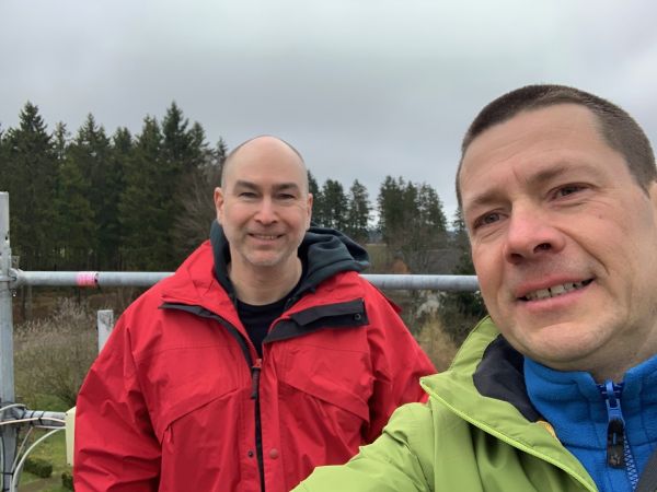 Unsere Arbeitswoche geht heute mit einem Außeneinsatz zu Ende: Karsten Brandt und Michael Hoffmüller-Klein befinden sich aktuell in schwindelerregender Höhe (genau genommen sind es etwa 10 Meter), um frische Technik an unserem Messturm im donnerwetter.de-Wetterpark in Hellenthal zu installieren.