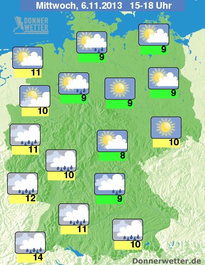Im Tagesverlauf zieht das nächste Regengebiet von Westen her nach Deutschland. Sonst wechseln Sonne und Wolken mit Schauern ab. Es bleibt mild. Bis zu 11 Grad C tagsüber und 14 Grad C am Donnerstag.