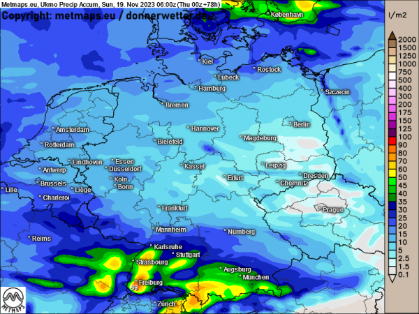 Die Grafik zeigt die akkumulierte Regenmenge bis Sonntag (06:00 Uhr) für Deutschland: