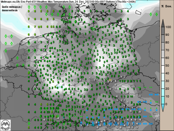 Die Karte zeigt die Berechnung (Lufttemperatur, Bewölkungsgrad, Niederschlagsform) des US-amerikanischen GFS-Modells für den 24.12.2023 (00:00 Uhr).
