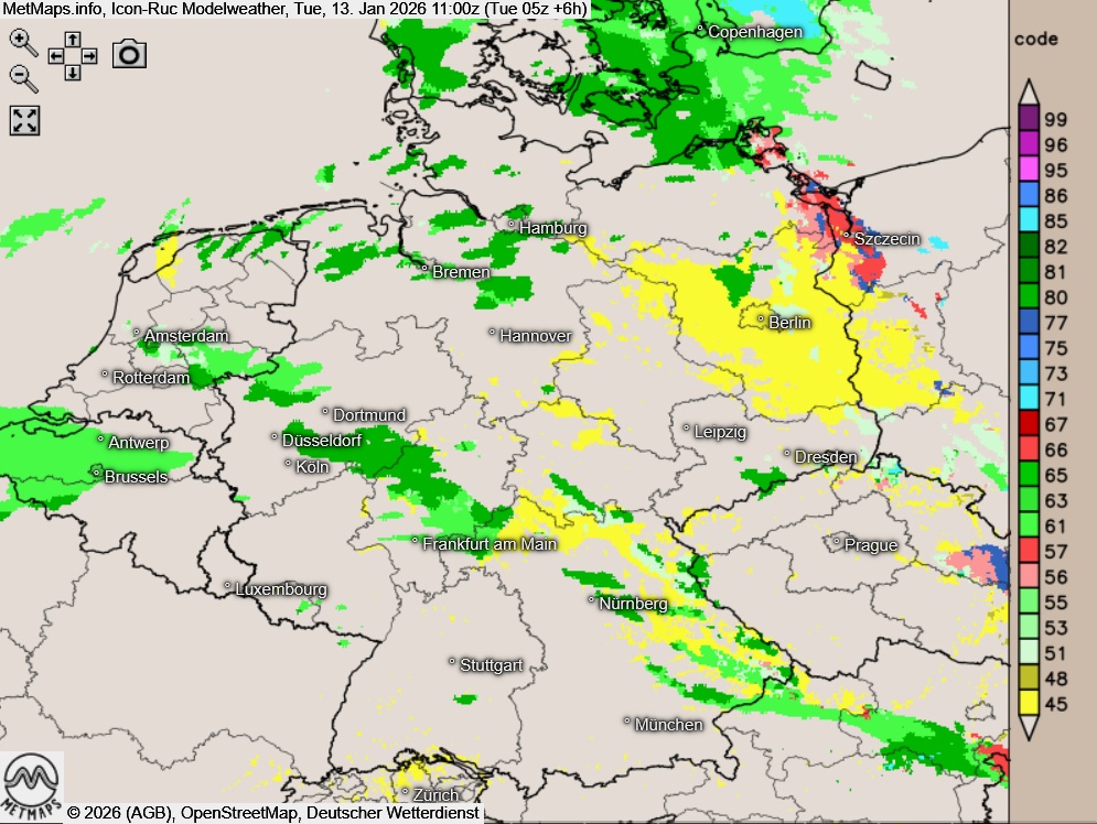 Die aktuelle Unwetterwarnkarte sowie die Wetterkarte nach ICON-RUC (07:00 Uhr und 11:00 Uhr) mit den Eisregenbereichen in rot: