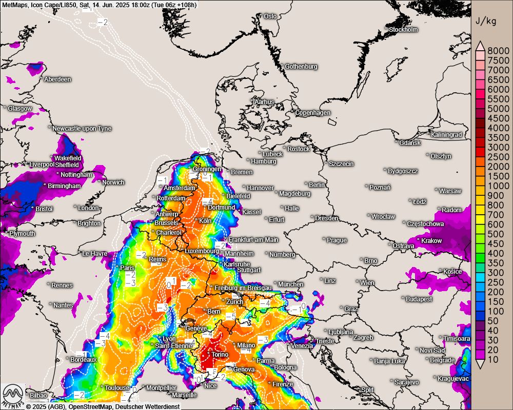 Im Westen herrscht am Samstag nach dem Cape-Lifted-Index großes Auftriebspotential: Die Gewitter erreichen uns am Nachmittag und Abend aus Belgien, auch über das restliche Wochenende wird es in vielen Landesteilen gewittrig.