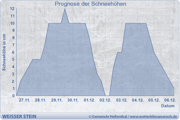 Hier auf knapp 700 m Höhe wird es bei einigen Flocken am ersten Adventswochenende nicht bleiben. Unsere Schneehöhenprognose geht aktuell von 12 bis 15 cm dicken Schneedecke aus, der aus derzeitiger Sicht auch noch das zweite Adventswochenende überdauern wird.