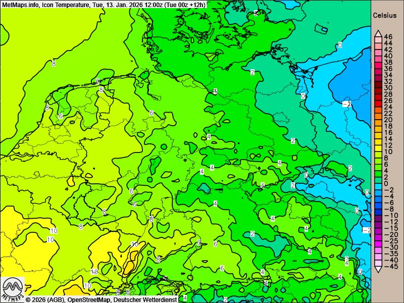 Die Wetter- und Temperaturkarte für Dienstagmittag (12:00 Uhr) nach ICON: