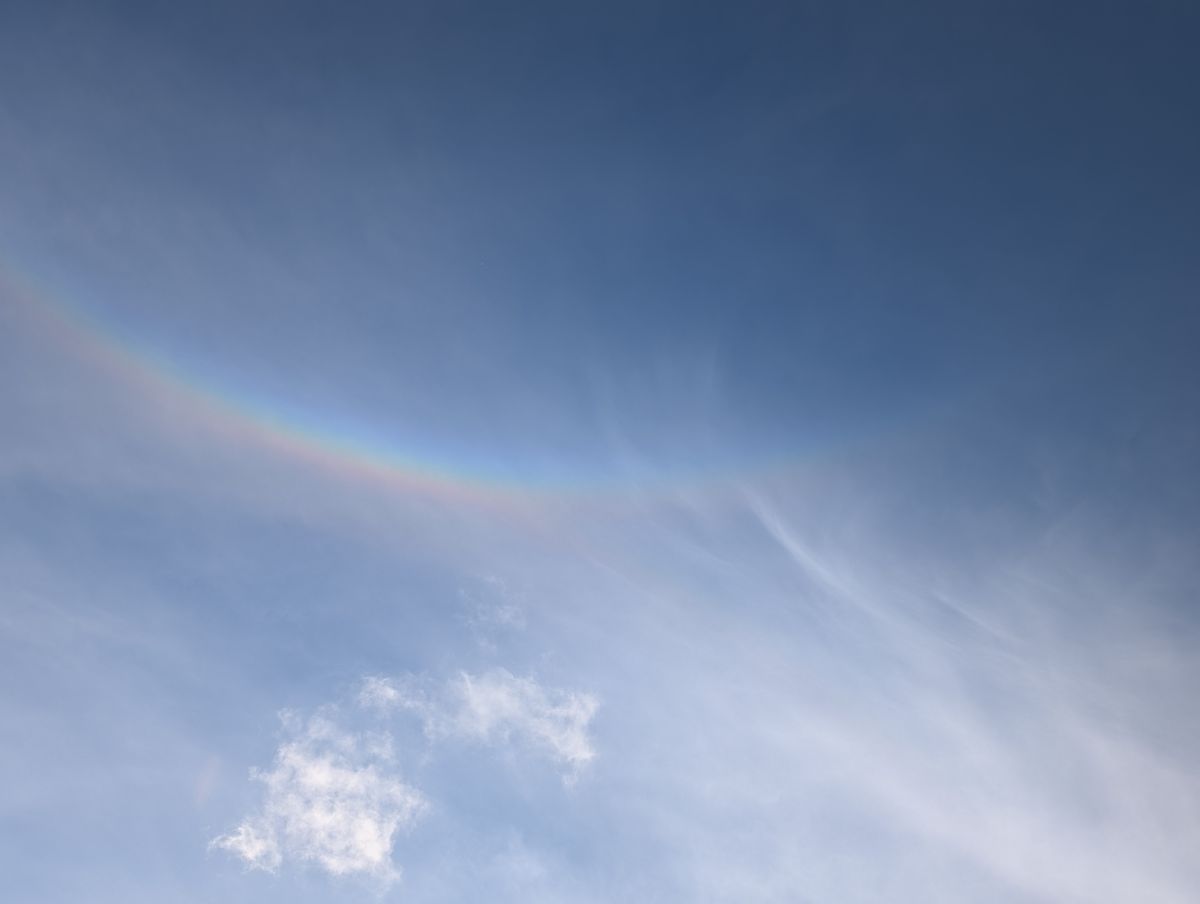 Weniger bekannt, aber nicht minder spektakulär, ist der Zirkumzenitalbogen. Er zeigt sich als farbenprächtiger Bogen hoch am Himmel, dessen Form an einen „umgekehrten Regenbogen“ erinnert. Anders als dieser entspringt er nicht Regentropfen, sondern ebenfalls Eiskristallen: Flache, plankristalline Eisplättchen lenken das Sonnenlicht so ab, dass in der Nähe des Zenits ein intensiv gefärbter Bogen sichtbar wird.