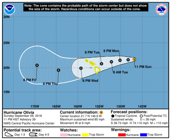 In den nächsten 36 Stunden zieht Hurrikane Olivia über Hawai hinweg. Es werden große Schäden auf den Inseln befürchtet. Hier der Weg des Zyklon: