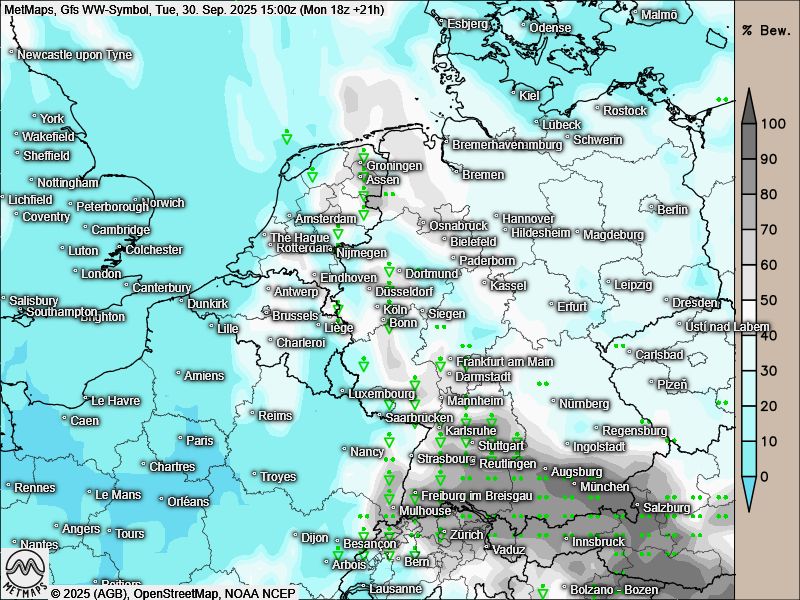 Am heutigen Dienstag fallen nachmittags einzelne Schauer, im Süden auch etwas länger Regen: