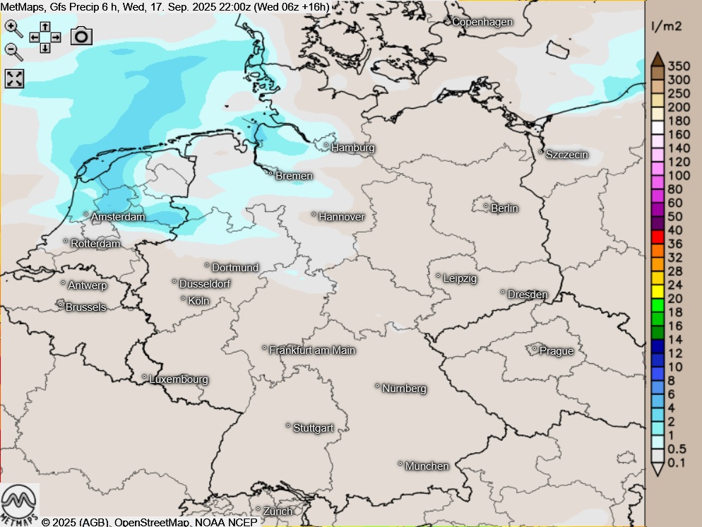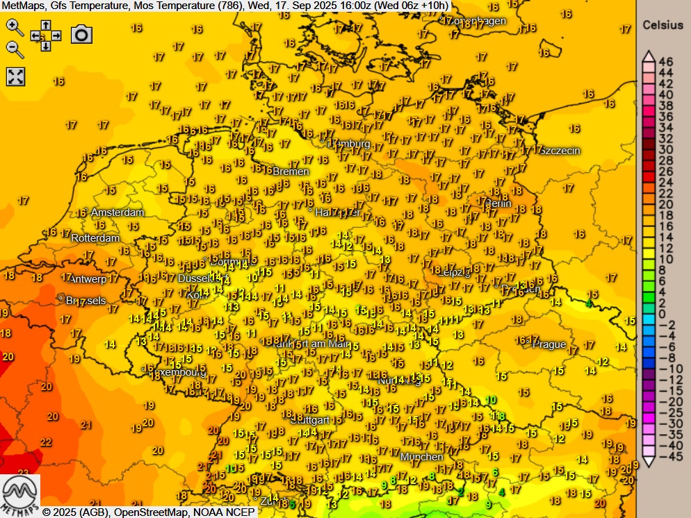 Die Temperaturkarte für Mittwochnachmittag (16:00 Uhr) sowie die Sechs-Stunden-Regenmengen bis 22:00 Uhr nach GFS: