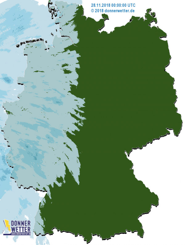 Heute fällt tagsüber ganz im Westen, sowie im Nordwesten gelegentlich Regen oder Sprühregen. Die Niederschlagsmengen liegen meist zwischen 1 und 8 Liter pro Quadratmeter. Sonst bleibt es dank leichtem Hochdruckeinflusses bei dem ruhigen und trockenen Novemberwetter.