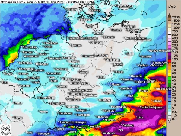 Das britische UKMO-Modell rechnet binnen 72 Studen mit Regenmengen von teilweise 200 l/m², ECMWF kommt in diesem Zeitraum "nur" auf 130-140 l/m². Die Unsicherheiten sind also noch groß.