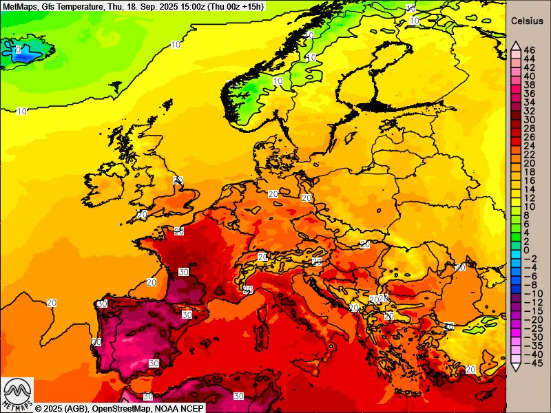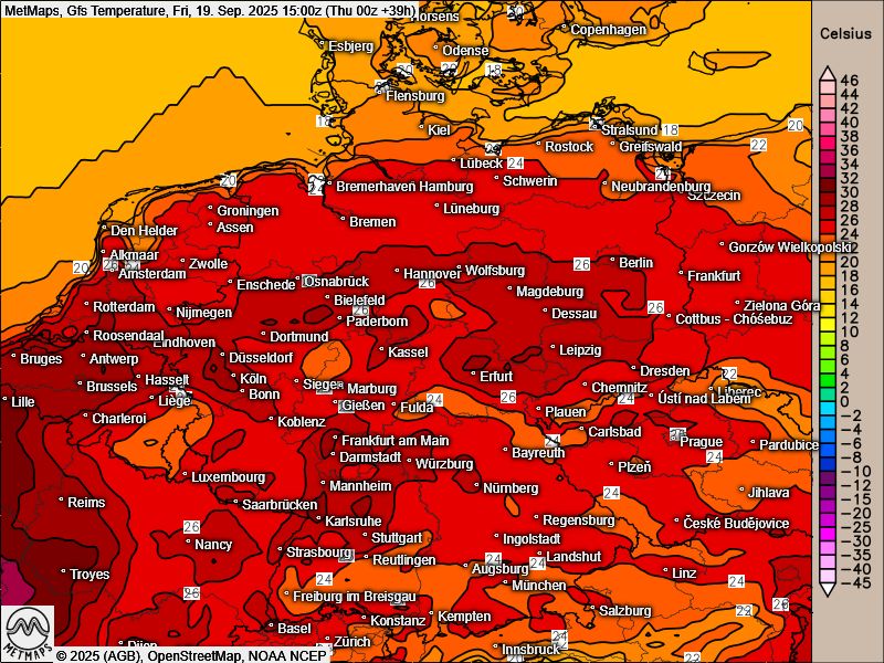 Die Wetterkarte sowie die Europatemperaturen am Donnerstagnachmittag und die Lufttemperaturen in Deutschland am Freitagnachmittag nach GFS: