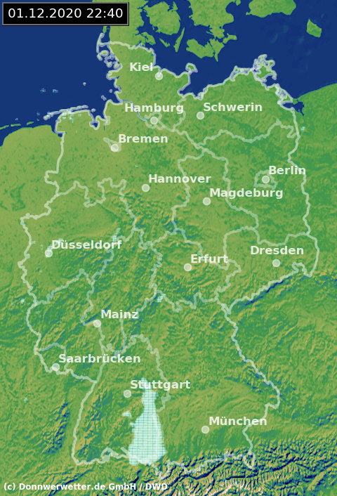 Das Radarbild zeigt im Süden noch ein schwaches Niederschlagsecho mit leichten Schneefällen, das langsam westwärts wandert und sich dabei abschwächt. Sonst präsentiert sich der Himmel über Deutschland überwiegend wolkenverhangen oder neblig-trübe mit stellenweise leichtem Sprühregen oder Schneegriesel. Nur in Teilen von Sachsen und Brandenburg, sowie im Bayerischen Wald und auf auf den Gipfeln des Südschwarzwaldes leuchten Mond und Sterne.