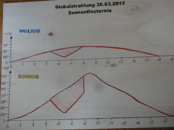 Globalstrahlung bei wolkigem und sonnigem Himmel am 20.3.; schraffiert ist der Zeitraum der SoFI.