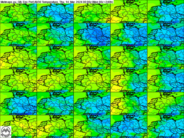 Ob es so kommt, ist aktuell aber noch äußerst unsicher, wie auch das GFS-Temperaturmodell-Ensemble für den 14.03. zeigt: Von spätwinterlich bis vorfrühlingshaft sind hier noch alle Varianten im Rennen.