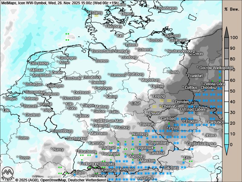 Das Satellitenbild (IRC) für Europa (26.11.) sowie die Wetterkarten für Mittwochnachmittag und Donnerstagfrüh nach ICON: