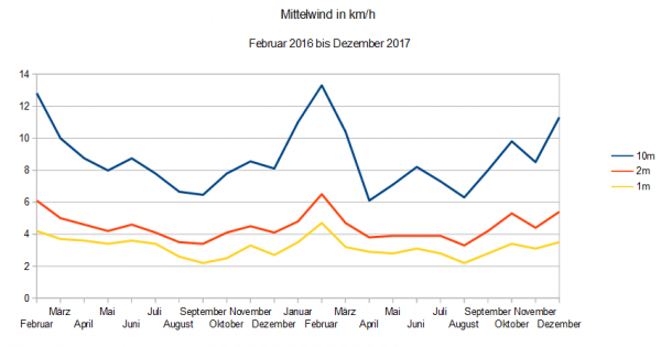 Interessant zur Klärung der Frage, ob sich eine Windkraftanlage lohnt, ist vor allem die Mittelwindgeschwindigkeit in 10 Metern Höhe, in der Grafik mit der blauen Linie dargestellt.