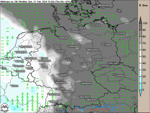 Die Karte zeigt das Deutschlandwetter mit Bewölkungsgrad und Niederschlag (grün) am Sonntag (15:00 Uhr).