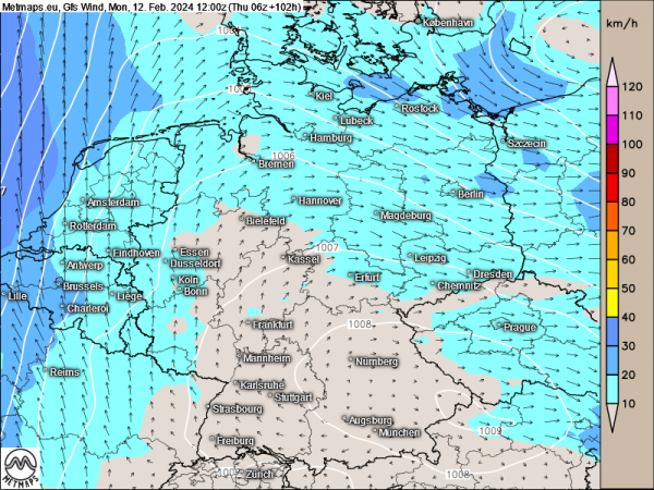 Die Karte zeigt die zu erwartenden Spitzenwindgeschwindigkeiten in Deutschland für Rosenmontag (12:00 Uhr).