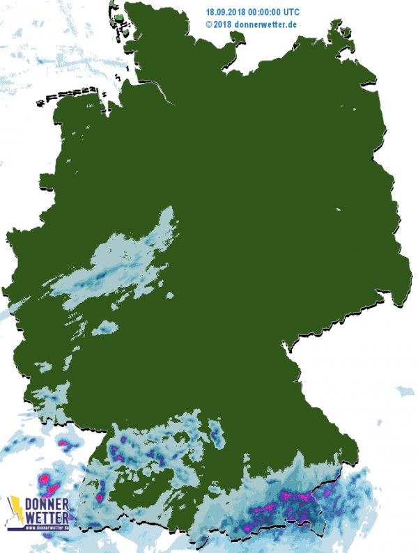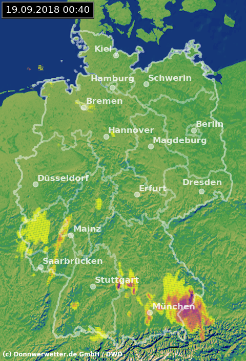 Das Radarbild zeigt aktuell einige Schauer- und Gewittercluster hauptsächlich über Bayern und ein schmales Schauerband über Rheinland-Pfalz. In Fürstenzell bei Passau (Bayern) prasselten in der letzten Stunde beispielsweise 16,6 Liter Niederschlag vom Himmel. Sonst präsentiert sich der Himmel über Deutschland häufig sternenklar oder nur leicht bewölkt, im Süden teilweise auch wolkenverhangen.