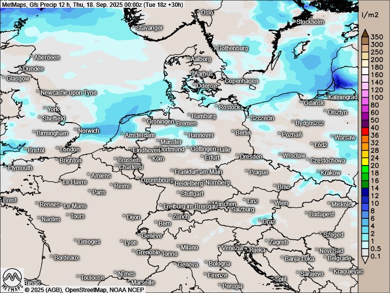 Die Lufttemperaturen für Mittwoch- und Donnerstagnachmittag (15:00 Uhr) sowie die 12-Stunden-Regenmengen bis Donnerstag (00:00 Uhr) nach GFS: