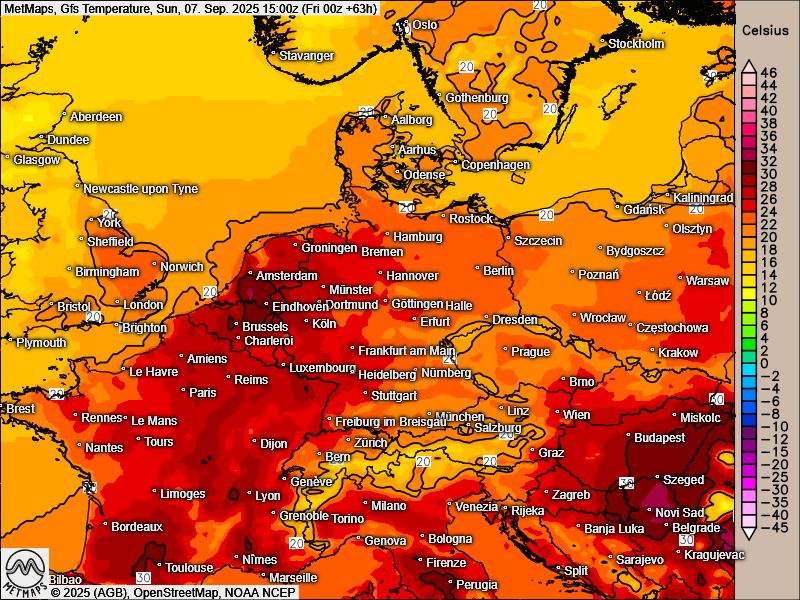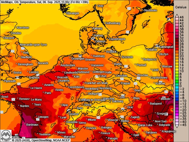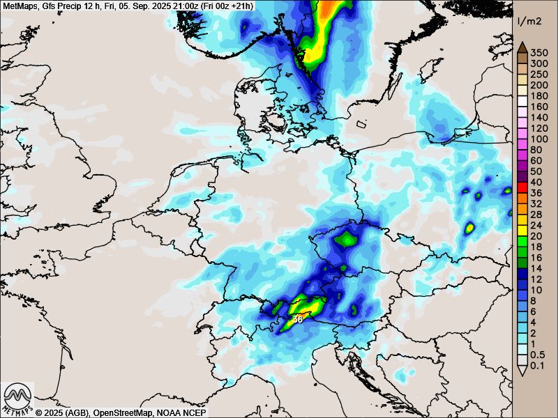 Die Karten zeigen die Lufttemperaturen in Europa am Samstag- und Sonntagnachmittag (15:00 Uhr) sowie die 12-Stunden-Regenmengen bis Freitagabend (21:00 Uhr) nach GFS: