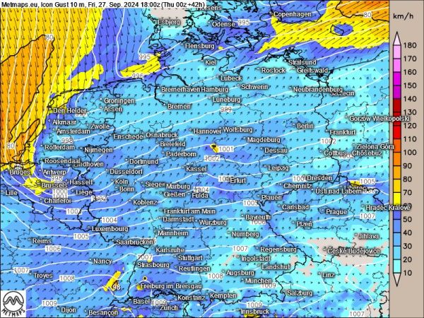 Die aktuellen Windmodelle variieren zur Zeit aber noch stark bei der kleinräumigen Prognose des Randtiefs: Nach Icon ist sein Verlauf mit Spitzenböen von 60 bis 70 km/h eher harmlos. Deutlich stärkere Böen prognostizieren dagegen die US-amerikanischen und britischen Modelle GFS und UKMO.