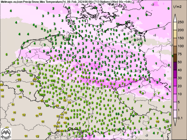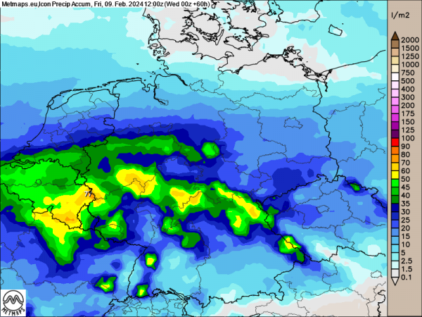Die folgende Karte zeigt die zu erwartenden Gesamtniederschlagsmengen für Deutschland bis Freitagmittag (09.02.2024). Gebietsweise kommen bis dahin bis zu 70 l/m² zusammen. Für Hochwasser an den größeren Flüssen reichen die Regenmengen wohl nicht aus, an kleinen Bächen können die Pegel aber durchaus stark zulegen.