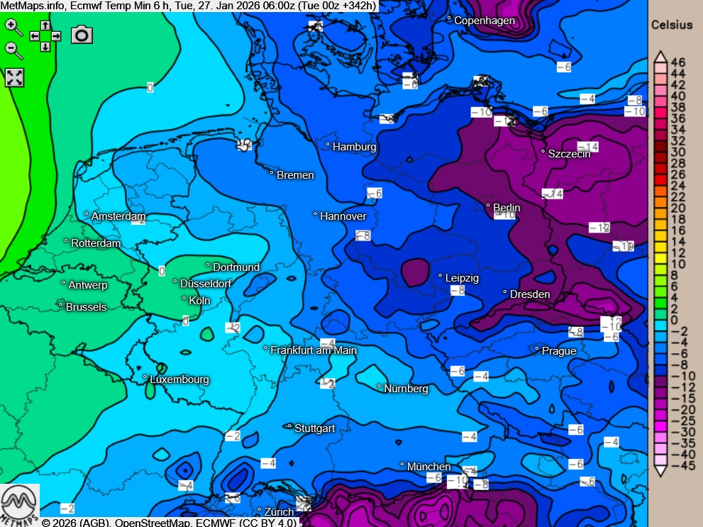 Die Sechs-Stunden-Temperaturminima und die Schneehöhen für den 27.01. (06:00 Uhr) nach ECMWF sowie die 24-Stunden-Schneemengen bis 28.01. (06:00 Uhr) nach GFS: