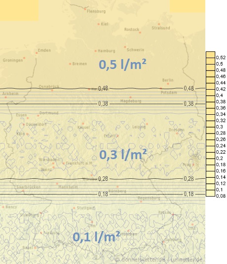 Am Montag fällt im Südosten und Osten Schnee, sonst setzt sich leichte Milderung mit etwas Regen oder Sprühregen durch. Die Niederschlagsmengen liegen im Osten und Südosten zwischen 5 und 15 Liter pro Quadratmeter.