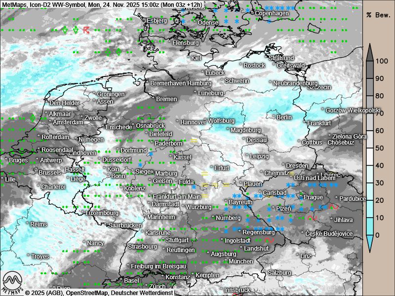 Die Wetterkarten für Montagfrüh und -nachmittag sowie die Temperaturkarte für 15:00 Uhr nach Icon:
