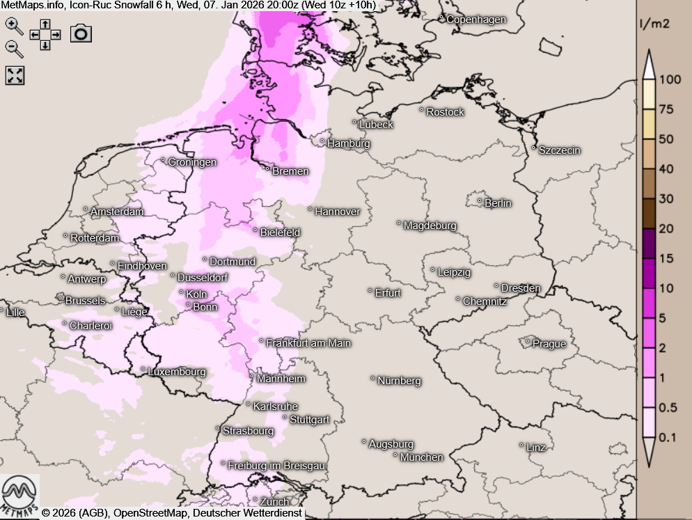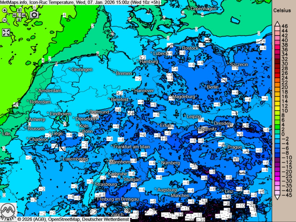 Die Wetter- und Temperaturkarte für Mittwochnachmittag (15.00 Uhr) sowie die Sechs-Stunden-Schneemengen bis 20:00 Uhr nach ICON-RUC.