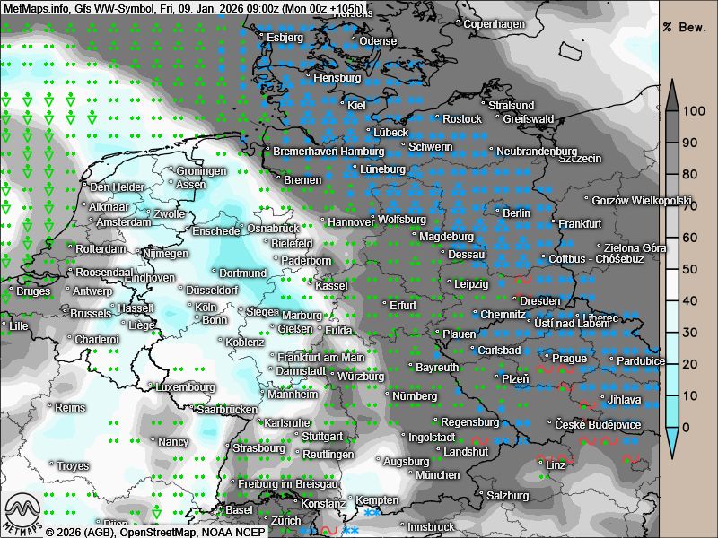Die Wettermodelle zeigen für Freitag im Zuge des Übergangs zu einer milderen Westströmung eine mögliche Schnee- und Sturmlage. Besonders betroffen wären dabei der Norden sowie der Osten Deutschlands.