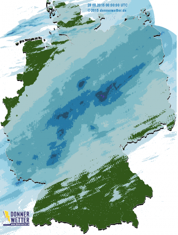 Noch deutlich zu sehen ist das Regenband der letzten 24 Stunden über Deutschland. Dies ist nun Geschicht, nachdem die letzten Schauer gestern Mittag über Süddeutschland abzogen.