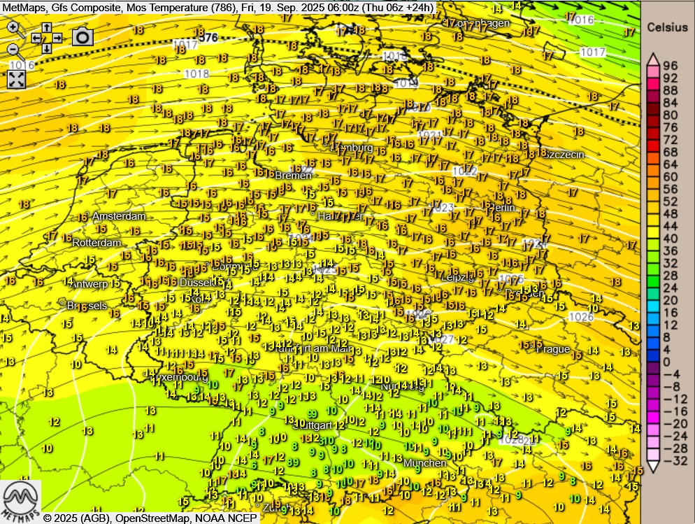 Die Strömungs- und Temperaturkarte für Freitagmorgen (06:00 Uhr) nach GFS: