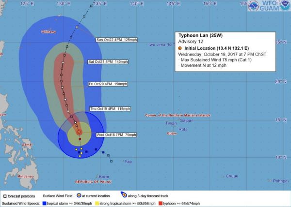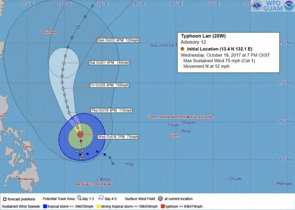 Da sich das Sturmsystem allerdings nur sehr langsam fortbewegt, kann sich die tatsächliche Zugbahn auch noch ändern. Sollte "Lan" Kurs auf Japan nehmen, könnte es für Teile der Bevölkerung Anfang kommender Woche gefährlich werden. Die derzeitigen Berechungen des JTWC (Joint Typhoon Warning Center) gehen von Spitzenwindgeschwindigkeiten um 150 mph (ca. 240 km/h) aus.