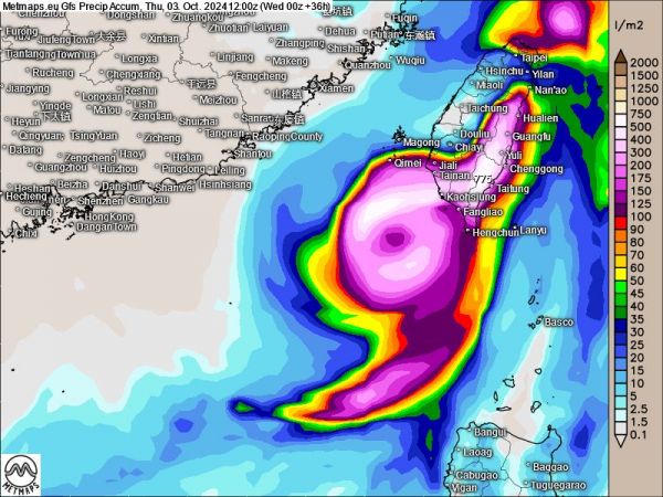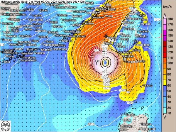 Neben den immensen Regenmenge sind natürlich auch starke Winde ein Thema - zu sehen ist die GFS-Windprognoe für heute 12:00 Uhr für Taiwan. Das aktuelle Prognosemodell geht von Windspitzen bis 162 km/h aus, lokal dürften die Böen mit Höchstgeschwindigkeiten deutlich über 200 km/h aber noch über diesem Wert liegen:
