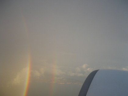Wolkenaufnahmen auf dem Flug von Griechenland nach Deutschland, mit doppeltem Regenbogen, Schauer- und Gewittewolken.