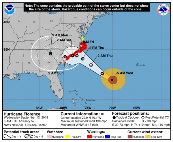 Allein von seiner Stärke könnte "Florence"  im Jahr 2018 mit "Harvey" (4), "Irma" (5) und "Maria" (5) gleichziehen - einkategorisiert wird der aktuelle Hurrikan aktuell auf Stufe 4 bis 5.