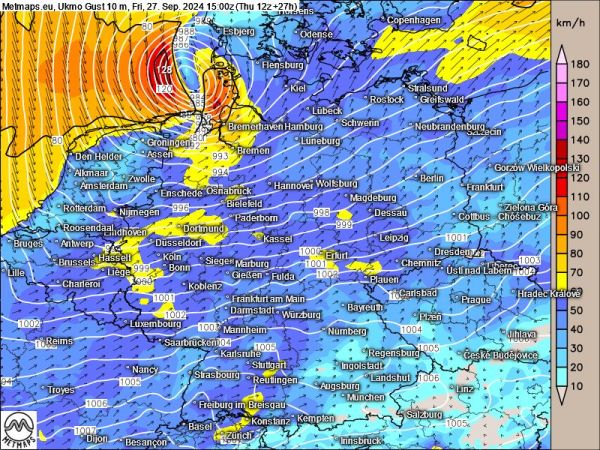 Die meisten Wettermodelle sehen das kleine Sturmtief am heutigen Freitag nun überwiegend über die Nordsee und die Inseln hinwegziehend. Hier sind heute Windgeschwindigkeiten von 120 km/h und mehr möglich. Das US-amerikanische GFS-Modell verlagert das Hauptfeld mehr nach Süden (siehe Karten).