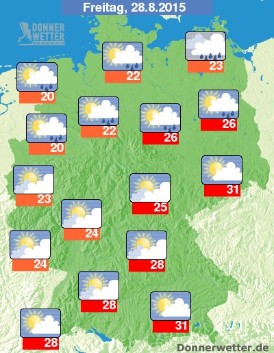 Am Donnerstag hält sich das Wetter weiterhin in der Südhälfte Duetschlands heiter, teilweise auch sonnig. Die Regionen Berlin und Sachsen zeigen ebenfalls einen heißen tag an. An der Ostseeküste und im Ostfriesland sind mit Regenschauern zu rechnen. An der Nordseeküste zeigt sich der Himmel and er Weser entlang bedeckt.